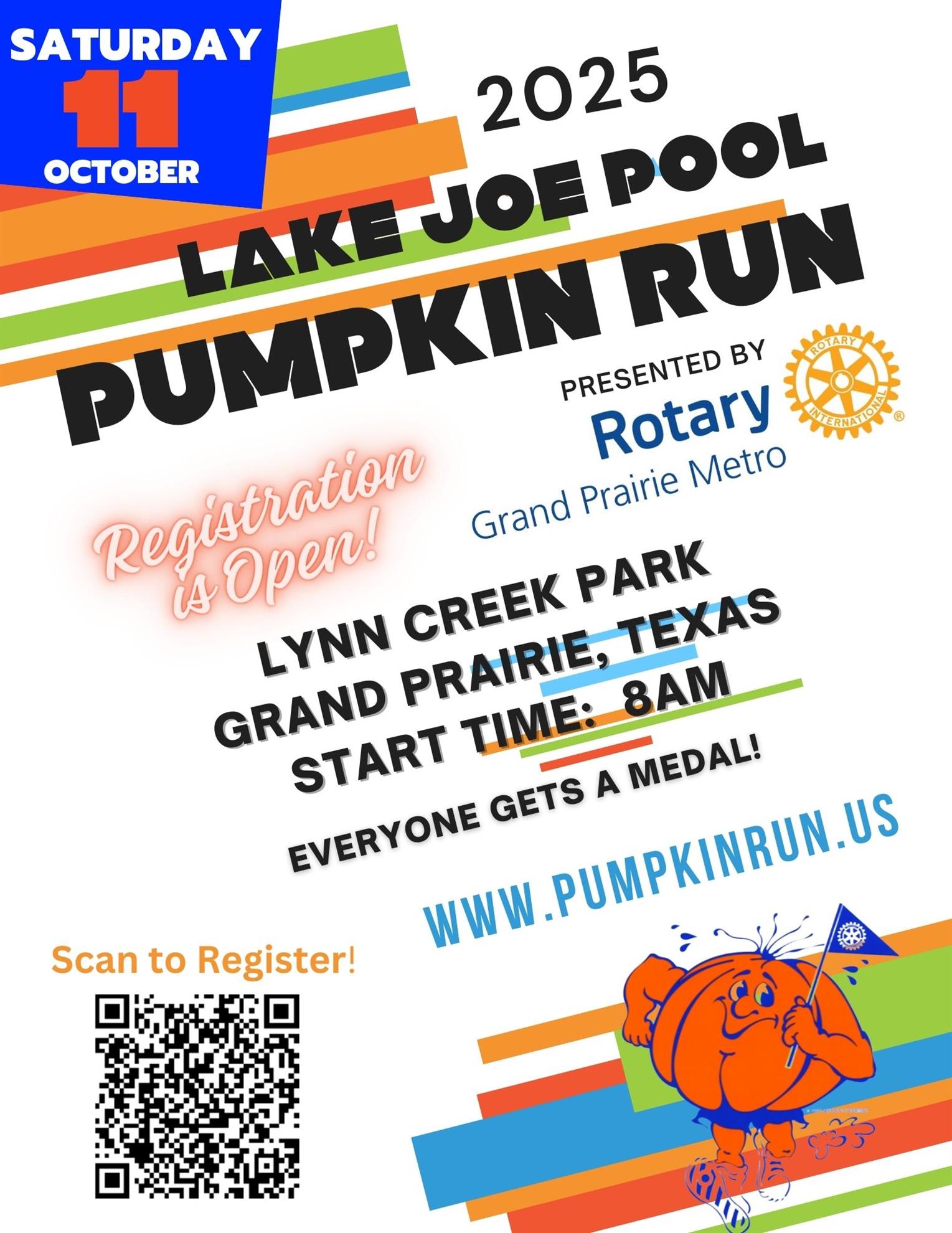 Join Grand Prairie Metro on Saturday, October 11, 2025, for our 39th Anniversary PUMPKIN RUN 10K, 5K & 1Mile run/walk event through the beautiful Lynn Creek Park surrounded by Joe Pool Lake. Enjoy a FREE pancake breakfast, a special warm-up activity, face painting, pumpkin decorating, a remote control drag-racing track, vendors, and more!