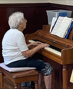 Her boss was a member of the club. This was back when women were not allowed to be members - so she had to leave as soon as the meeting started! She says that she was always back to work within an hour! She still plays piano for the club today.