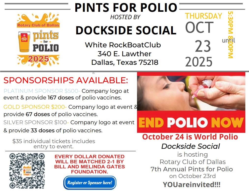Join the Rotary Club of Dallas' Pints for Polio hosted by Dockside Social on Thursday, Oct. 23rd at 5;30PM! Raise a glass and make a difference at our exciting Pints for Polio event!