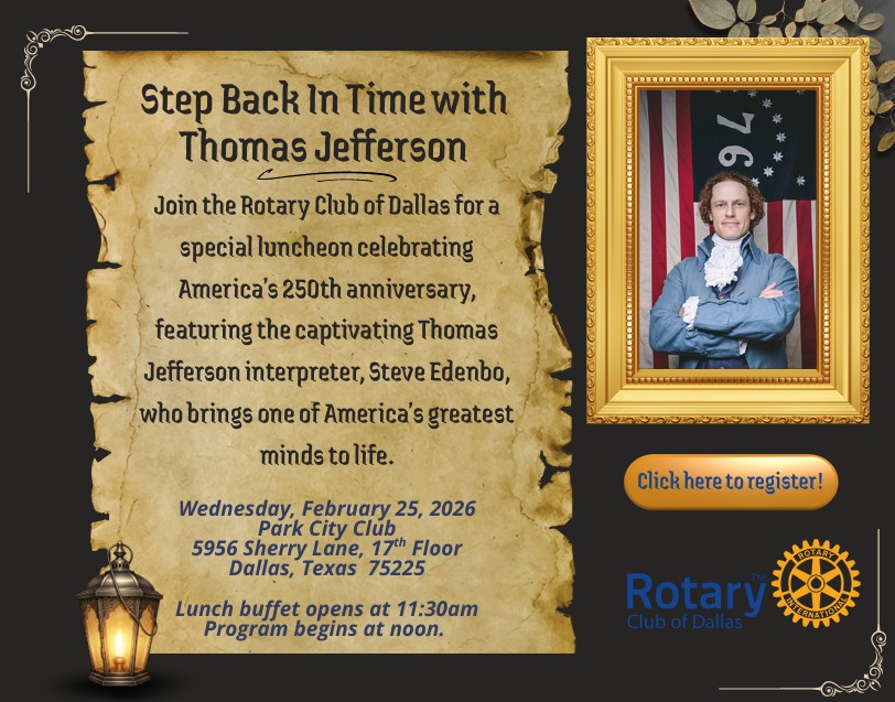 Join the Rotary Club of Dallas for a special luncheon celebrating America’s 250th anniversary, featuring the captivating Thomas Jefferson interpreter, Steve Edenbo, who brings one of America’s greatest minds to life. Thomas Jefferson was an American titan who led by persuasion, intellect, and conversation rather than coercion.