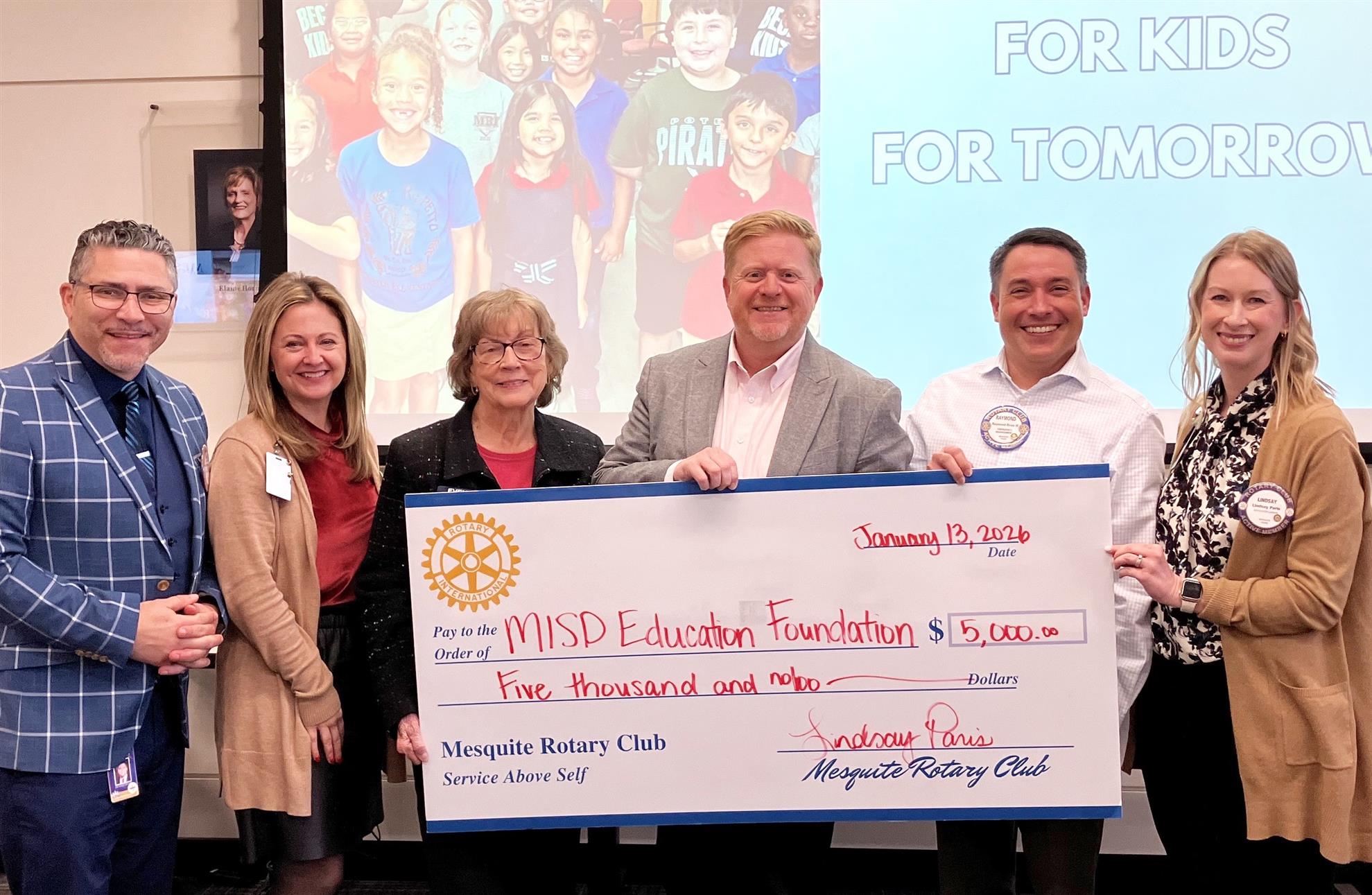 Mesquite Rotary Club president Lindsay Paris presented a $5,000 donation check to the Mesquite ISD Education Foundation at their meeting on January 13th. Foundation executive director Randy Lewallyn accepted the check.