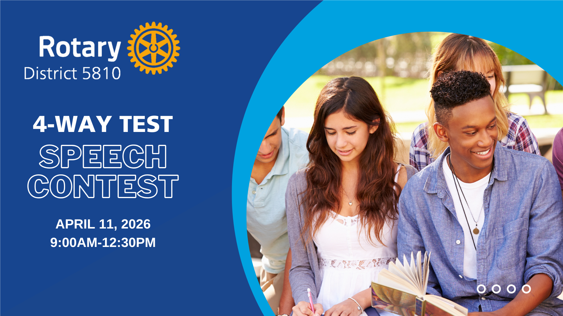 Please save the date for the District 5810 4-Way Test Speech Contest, scheduled for Friday, April 11. This signature Rotary program gives students the opportunity to sharpen their public speaking skills while reflecting on the values of the Four-Way Test.